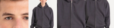 70% ringspun cotton/20% polyester/10% recycled polyester.* Cotton faced fabric. Brushed back fleece. Drop shoulder style. Oversized fit. Three panel double fabric hood. Full length two way zip. Front pouch pockets. Ribbed cuffs and hem. Twin needle stitching. Tear out label.