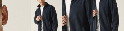 Warm backed woven recycled polyester outer. Showerproof and wind resistant. Quick drying. Full length low profile zip with chin guard and inner zip guard. Right chest zip pocket. Two front zip pockets.