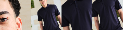 Double piqué. Quick drying fabric with wicking properties. Regular fit. Stand up collar. 1x1 ribbed collar and cuffs. Three self colour button placket.
